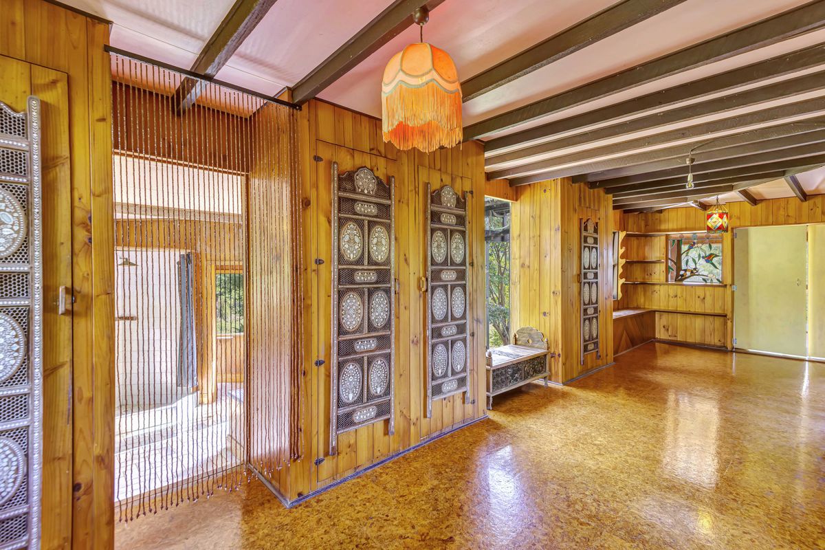 Elevated high on a flood-free plateau at the very end of a quiet internal road, this 5-bedroom, 1-bathroom home has been handcrafted by local carpenters, stonemasons and artists and offers rustic charm, sustainable living, and panoramic views toward Nightcap National Park.